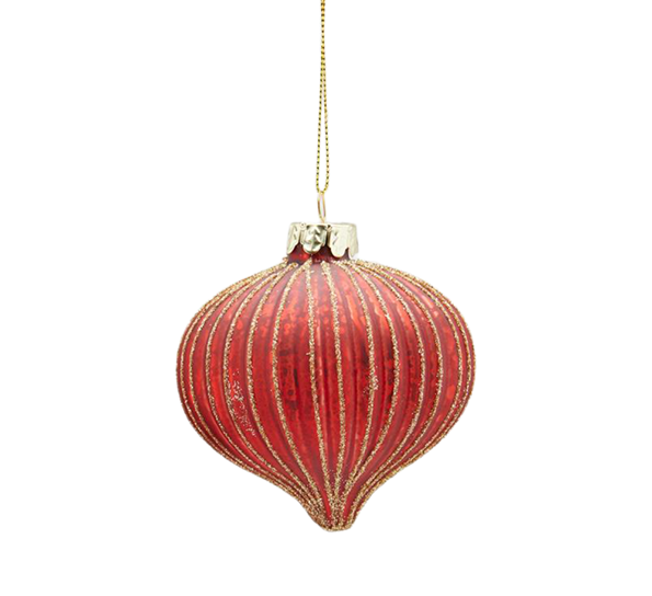 Denne varianten med form som en løk av EDG sine julekuler i rødt og gull har en diameter på 8 cm.