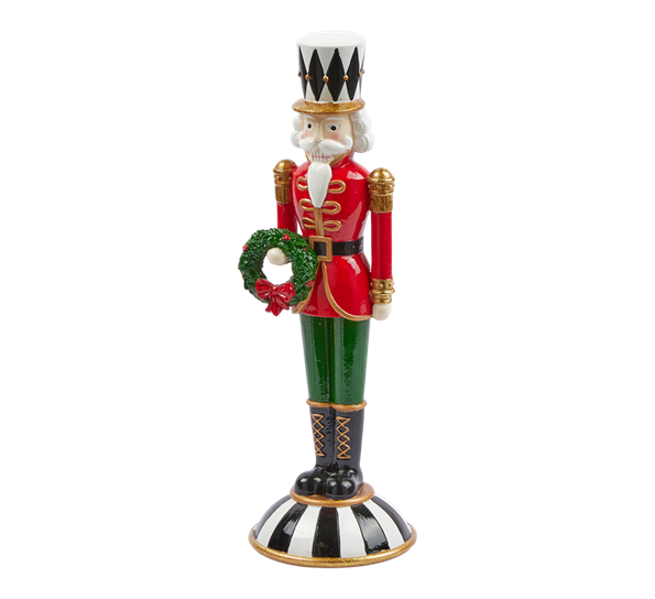 Denne sjarmerende nøtteknekkeren fra italienske EDG – Enzo De Gasperi er 30 cm høy og er en flott tillegg til juledekorasjonen. Kledd i en stilig rød uniformjakke og grønne bukser, står figuren på en elegant svart-hvit stripete base som gir et klassisk preg. I hånden holder han en grønn dørkrans med en rød sløyfe, noe som tilfører en festlig og tradisjonell julestemning. Denne nøtteknekkeren er ikke bare en dekorativ figur, men et symbol på den klassiske juletradisjonen, perfekt for å tilføre hjemmet ditt et snev av nostalgi og eleganse i høytiden.