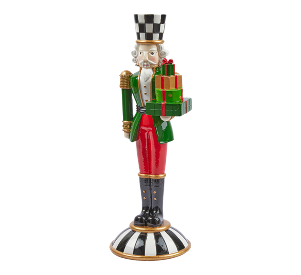 Denne sjarmerende nøtteknekkeren fra italienske EDG – Enzo De Gasperi er 41 cm høy og en perfekt detalj til julepynt. Figuren, med sin klassiske uniform i grønn, rød og gull, balanserer stolt på en stripete base med gaver i hånden. Hatten er dekorert i et tidløst sjakkmønster, som gir et unikt og lekent preg. Nøtteknekkerens tradisjonelle design kombinerer eleganse og historie, og gir hjemmet ditt en sofistikert julefølelse. Denne figuren er ikke bare et symbol på julens festligheter, men også et flott samleobjekt som gir en ekstra touch av klassisk juleglede til ethvert rom.