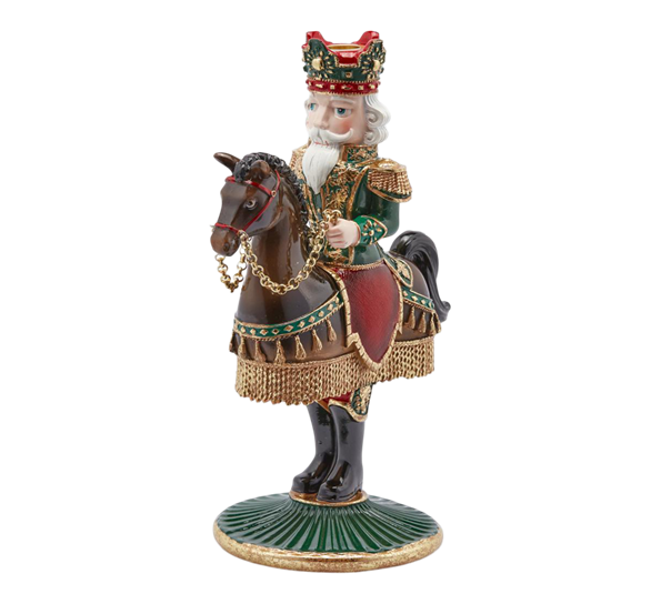 Denne nøtteknekker lysestaken fra italienske EDG - Enzo De Casperi er en leken og humoristisk vri på den klassiske juledekorasjonen. Her ser vi en nøtteknekker kledd i en flott grønn uniformsjakke med gulldetaljer, ridende på en brun hest. Men ved nærmere øyesyn ser man noe uvanlig – hestens ben mangler! I stedet stikker nøtteknekkerens egne ben ut under hesten, som om han har på seg et hestekostyme. Dette artige designelementet tilfører et snev av humor og fantasi til din julepynt. Nøtteknekkerens elegante, men morsomme uttrykk gjør denne lysestaken til et blikkfang, og passer godt inn sammen med andre dekorasjoner fra EDG.