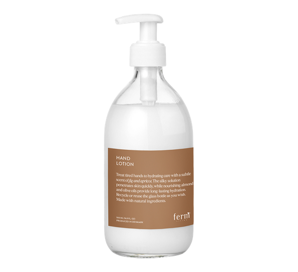 Skjem bort slitne hender med denne fuktighetsgivende håndkremen fra Ferm Living. Lotionen har en subtil duft av fiken og aprikoser. Den silkemyke kremen trenger raskt inn i huden, mens den nærende mandelen og olivenoljen gir langvarig fuktighet. Leveres i en påfyllbar glassflaske med pumpe. Det populære, danske merket Ferm Living finner du i våre butikker og her i nettbutikken, hvor du fritt kan velge å få varen sendt hjem eller pakket som gave og sendt direkte til gavemottaker.