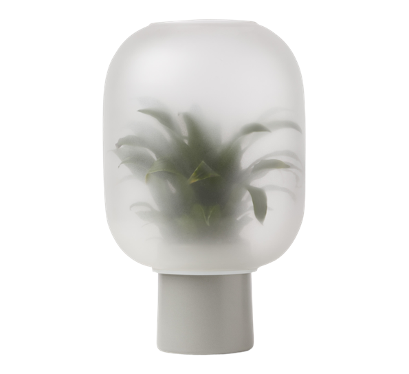 Krukkene Nebl består av to deler: en keramisk base som planten står i, og et frostet glass som settes på basen. Glasset har to åpninger i ulik størrelse som gir mulighet for å regulere høyden på glasset.