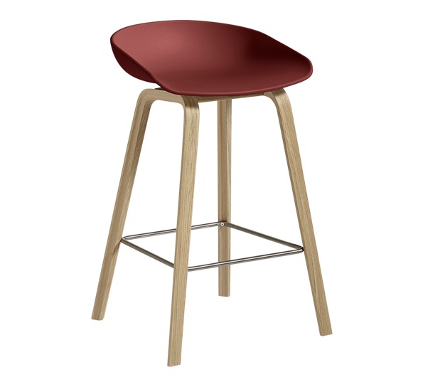 Barkrakken About A Stool fra HAY er designet av Hee Welling og finnes to høyder, og flere fine farger. Denne varianten med sittehøyde 64 cm har ben i mattlakkert eik, og mursteinrødt sete i plast. Fotstøtten er i blankt rustfritt stål. HAY ønsker å tilby kundene sine miljøvennlige og bærekraftige produkter. Stolene er derfor laget av FSC-sertifisert eik fra bærekraftig skog og er satt inn med vannbasert lakk. Vi anbefaler å etterstramme skruene under stolen med jevne mellomrom, og vedlikeholde treverket med fint pussepapir og ny såpebehandling etter behov. Husk også å kjøpe med AAS felt gliders filtknotter dersom du bruker stolen uten teppe under, så du ikke skraper opp gulvet. Filtknottene fra HAY som hører til AAS32 sitter mye bedre fast enn de man klistrer på. .
