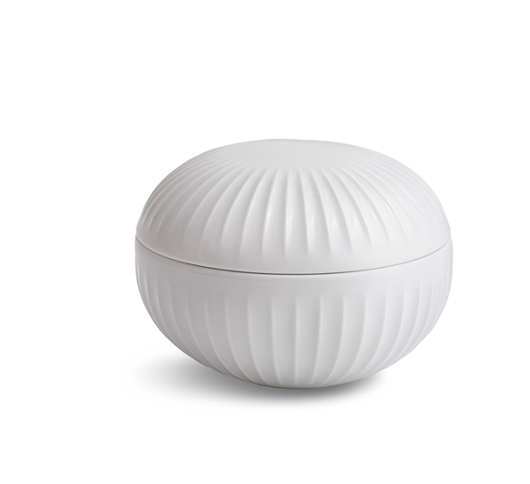 Krukkene med lokk er en del av Hammershøi-serien, dekorert med tidløse riller inspirert av kunstneren Svend Hammershøi. Bruk den til å holde orden på dine fineste skatter, eller når du server søtsaker til kaffen. Sammen med resten av Hammershøi-serien utgjør de et komplett servise. Denne bonbonnieren i hvitt har en diameter på 11,5 cm.