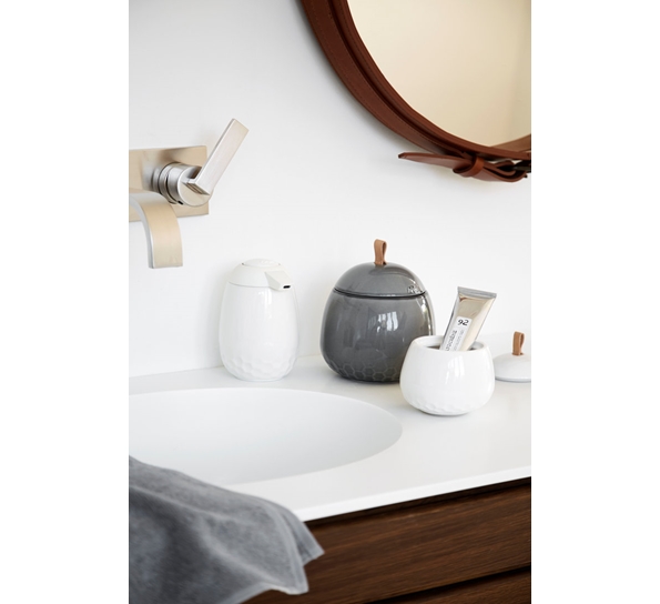 Mellibi er den første baderomsserien fra Kähler. Velg din favoritt som prikken over i-en på ditt bad, eller la hele serien gi badet en moderne og eksklusiv look. Oppbevaringskrukkene finnes i to størrelser, og har en flott lærdetalj på lokket.
