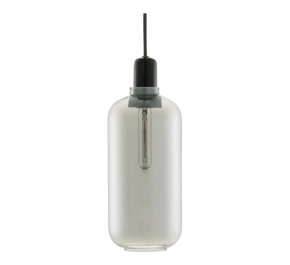 Normann Copenhagen Amp lamper i glass og marmor er designet av Simon Legald, som fikk ideen til designet mens han reparerte en gammel radio fra 60-tallet. Den ovale formen, pærene og selvsagt navnet Amp er alt i referanse til den gamle radioen. Denne lampen er den største i fargen grått/sort, og finnes også i en mindre variant og som bordlampe. Lampen blir levert med matchende stoffledning, og skjermene er enkle å fjerne når pæren skal skiftes. Velg mellom å få din favoritt sendt hjem fra nettbutikken, eller hent i en av utvalgte Designforevigbutikker som lagerfører Amp.