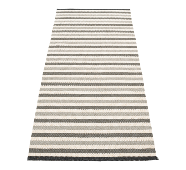 Teo fra det svenske merket Pappelina er en serie med lekre, håndvevde matter med noen elegante, store ruter. Mattene med sine trendy farger kommer i ulike størrelser. Denne Teo-matten måler 85x200 cm og kommer i den nydelige fargekombinasjon varmgrå, kull og vanilje.