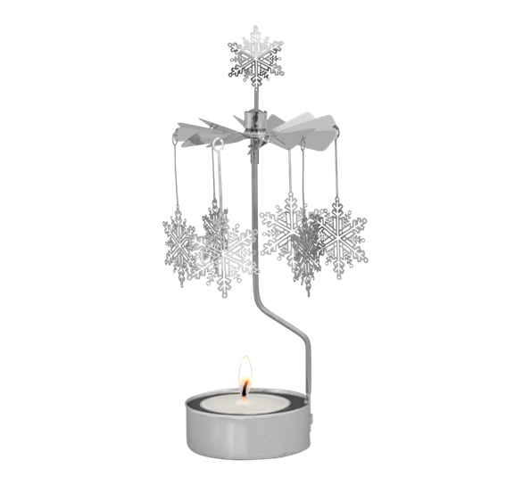 Dette englespillet i sølv med snøkrystaller er 16 cm høyt og har et telys til å drive det rundt. Plasser det på en hylle, et bord eller i vinduskarmen, og la de vakre englene snurrer rundt, og spre sin sjarm og glede.