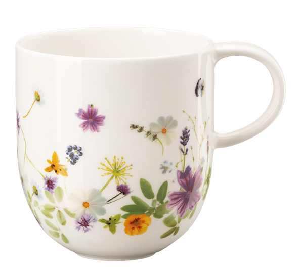 Denne gangen har den sveitsiske designeren Regula Stüdli fått sin inspirasjon fra den frodige urtehagen. Som navnet Grand Air tilsier så er dette et servise med lett og luftig design om naturopplevelser i frisk fjelluft. Brillance Grand Air fra Rosenthal er en herlig lek med naturen på et tynt, hvitt og delikat benporselen og en fest for alle sansene. Grand Air har en lekker samling av små engblomster, krydderurter og spiselige blomster, et perfekt servise til den lange, rolige frokosten i hagen en tidlig sommerdag når fuglene kvitrer og sola titter over fjellene, eller speiler seg i vannet. Designeren Regula Stüdli er en av de mest kjente tekstildesignerne i Sveits. Hun underviser i tekstildesign ved Lucerne University of Applied Sciences and Arts samtidig som hun har sin egen bedrift. For Rosenthal har hun blant annet designet dekorene Brillance Fleurs Sauvages, Fleurs des Alpes, Maria Pink Rose, Sanssouci Chambre Bleue og Maria Winter Rose. Dette kruset, som rommer 3,4 dl, i serviset Brillance Grand Air med sine nydelige blomster fra urtehager og friske enger minner oss om at måltider handler om ro og nytelse. Hovedfargen på blomstene er lilla.
