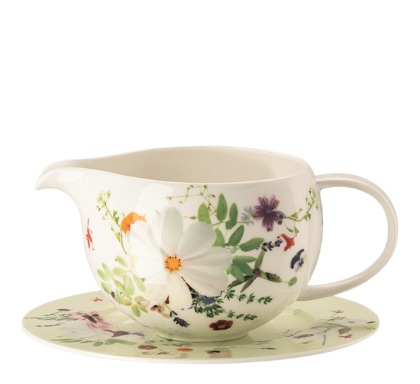 Denne gangen har den sveitsiske designeren Regula Stüdli fått sin inspirasjon fra den frodige urtehagen. Som navnet Grand Air tilsier så er dette et servise med lett og luftig design om naturopplevelser i frisk fjelluft. Brillance Grand Air fra Rosenthal er en herlig lek med naturen på et tynt, hvitt og delikat benporselen og en fest for alle sansene. Grand Air har en lekker samling av små engblomster, krydderurter og spiselige blomster, et perfekt servise til den lange, rolige frokosten i hagen en tidlig sommerdag når fuglene kvitrer og sola titter over fjellene. Designeren Regula Stüdli er en av de mest kjente tekstildesignerne i Sveits. Hun underviser i tekstildesign ved Lucerne University of Applied Sciences and Arts samtidig som hun har sin egen bedrift. For Rosenthal har hun blant annet designet dekorene Brillance Fleurs Sauvages, Fleurs des Alpes, Maria Pink Rose, Sanssouci Chambre Bleue og Maria Winter Rose. Dette sausnebbet med fat i serviset Brillance Grand Air med sine nydelige blomster fra urtehager og friske enger minner oss om at måltider handler om ro og nytelse.