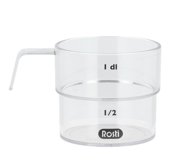 Dette desilitermålet er blank og rommer 1 dl og er inndelt i 1/2 og 1 dl.